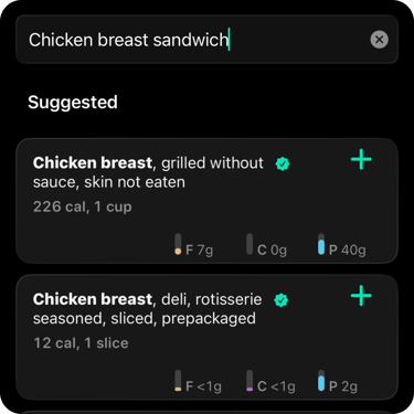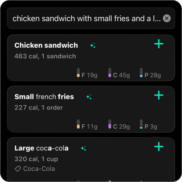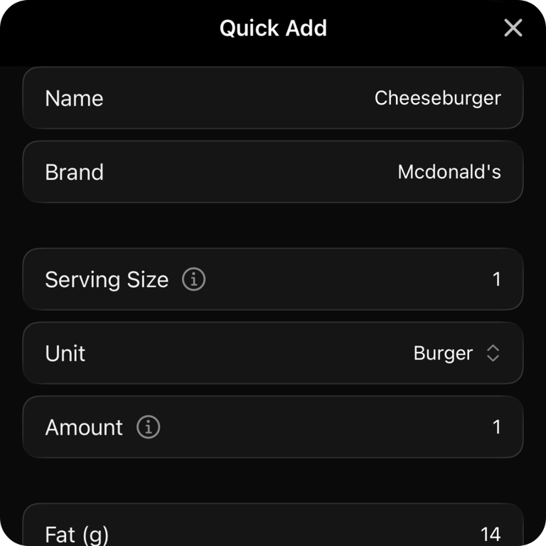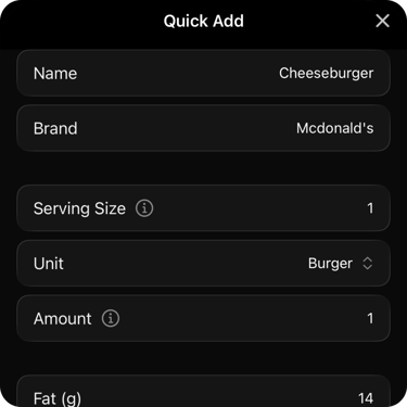 Type food names and search the database, or quickly add your own nutrition when you already know the numbers.